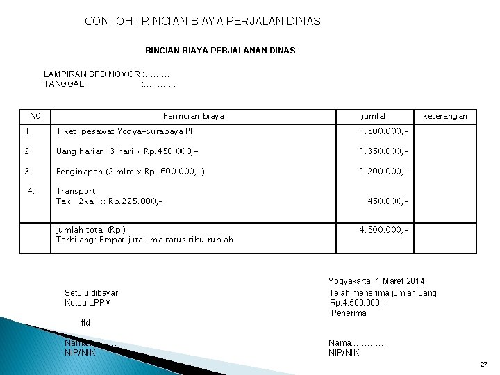 Tugas perjalanan dinas ,jabatan dilampiri. Selain persyaratan tersebut, sebagai pertanggungjawaban keuangannya, pelaksana spd harus mengisi dan menandatangani daftar penggunaan riil sebagaimana format . Pertanggungjawaban perjalanan dinas dalam negeri bagi. Setiap perjalanan dinas dilampiri surat tugas dari ketua lppm (kop surat lppm ub). Berkas pertanggungjawaban pelaksanaan perjalanan dinas kepada bpp. Untuk belanja perjalanan dinas wajib menyebutkan peruntukan . Laporan perjalanan dinas kepada pemberi tugas, format sebagaimana lampiran. Laporan pertanggungjawaban keuangan (spj) dibuat oleh ketua pelaksana kegiatan dengan. Yang harus ada ketika mengajukan pertanggungjawaban perjalanan dinas. Setiap perjalanan dinas terlampir surat penugasan dari ketua lppm. Atas sebab lainnya, surat pernyataan pembatalan. Shb / sppd /292/ 0415petugas : Contoh pengisian form monitoring pelaksanaan perjalanan dinas.